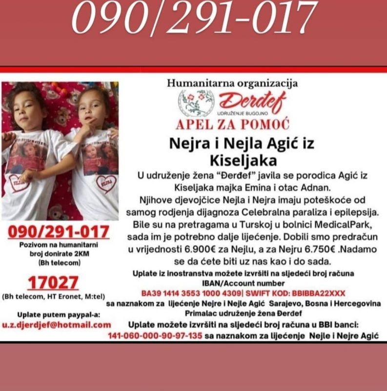 Nejla i Nejra Agić iz Kiseljaka su sestre blizanke koje trebaju našu pomoć. Boluju od cerebralne paralize i epilepsije. Bile su na pretragama u Turskoj, a sada trebaju na dalje liječenje.Roditelji djevojčica se zahvaljuju svima na dosadašnjoj pomoći, te se nadaju da će humani ljudi ponovo biti uz njih kao i dosad.